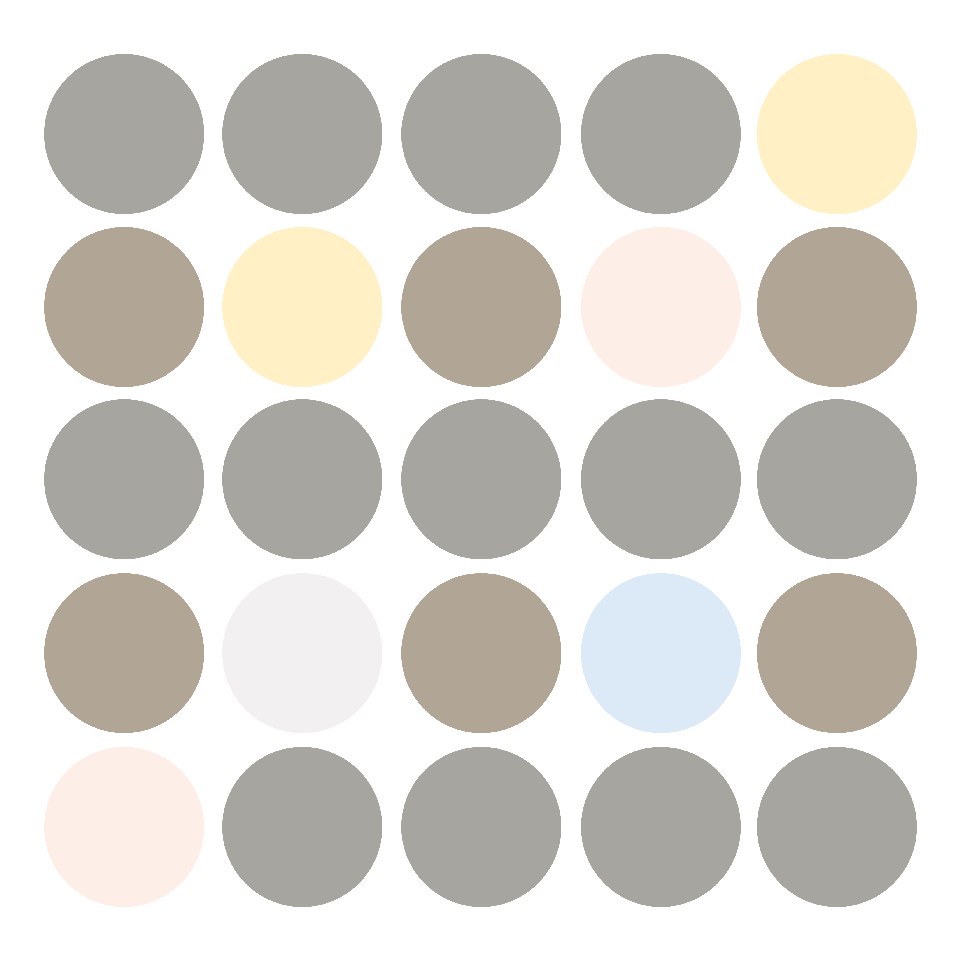 Die Festlegung auf 25 Punkte hat keine Bedeutung, sie erfolgte spontan, ist aber auch dem kleinen Format 30 x 30 cm geschuldet. Die Farben sind einfach Farben. Es ist eine Spielerei mit Punkten und Farben.