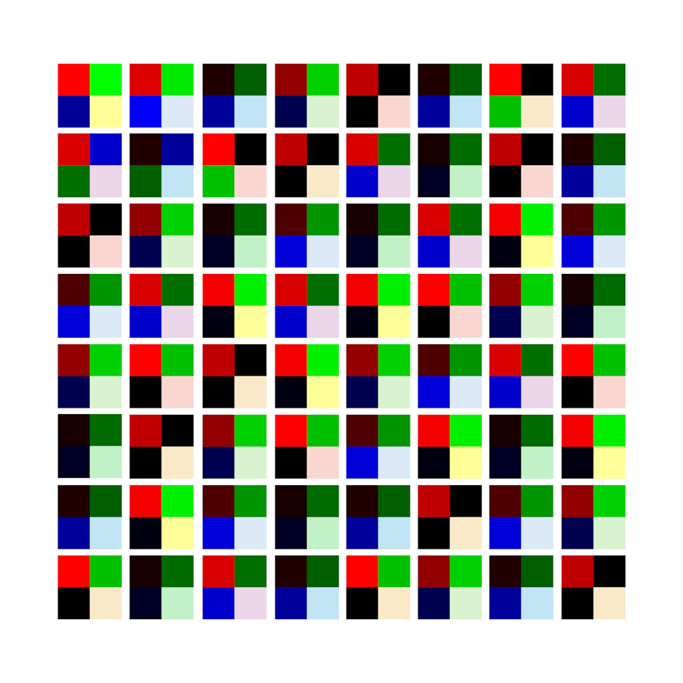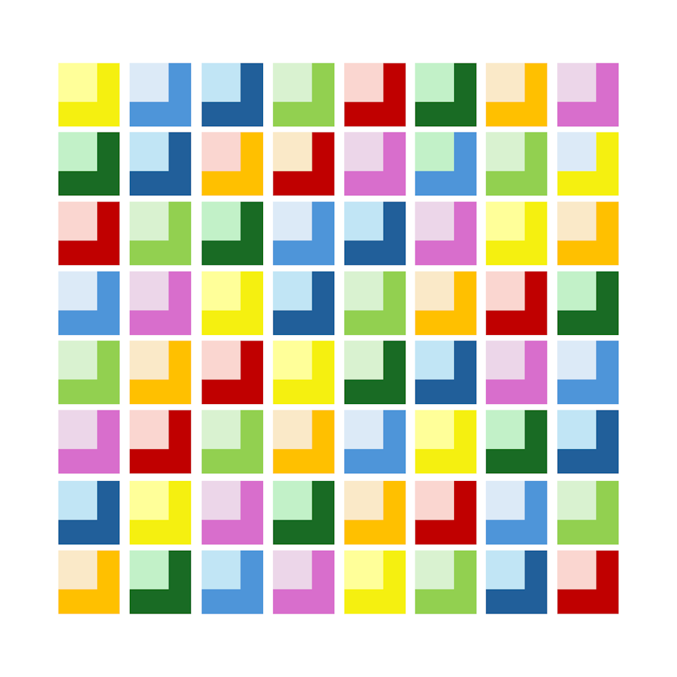 Ziel der Gestaltung war es, 8 Farben ähnlicher Farbigkeit in einer Reihe anzuordnen und diese dann in nicht-wiederholenden Permutationen zu einer 8x8-Matrix zu erweitern. In jeder Zeile und in jeder Reihe darf eine Farbe jeweils nur einmal auftreten. Die Reihenfolgen der Farben in einer Zeile und in einer Spalte dürfen nicht identisch sein. Die 8 Farben wurden nach gestalterischen Gesichtspunkten gewählt, es sollte jeweils ein R-, G-, B-Ton und ihre Komplementärfarbtöne CMY vorhanden sein, Cyan wurde in ein helleres Blau abgeändert, hinzugefügt wurden ein helleres Grün und Orange.