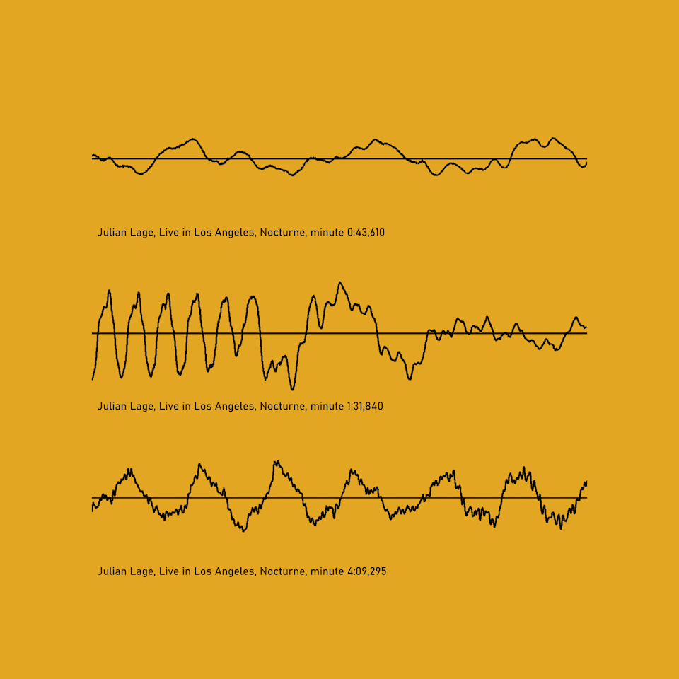 Die Bilder zeigen Auszüge aus dem Stück "Nocturne" aus dem Album "Live in Los Angeles" von Julian Lage aus dem Jahr 2016. Julian Lage ist ein außergewöhnlicher Gitarrist aus den USA. Die Bilder zeigen jeweils drei kurze Abschnitte des linken Stereokanals mit einer Signallänge von ca. 50 ms aus verschiedenen Abschnitten des Stücks. Als Hintergrund für die Bilder wurden die Farben des Albumcovers verwendet.