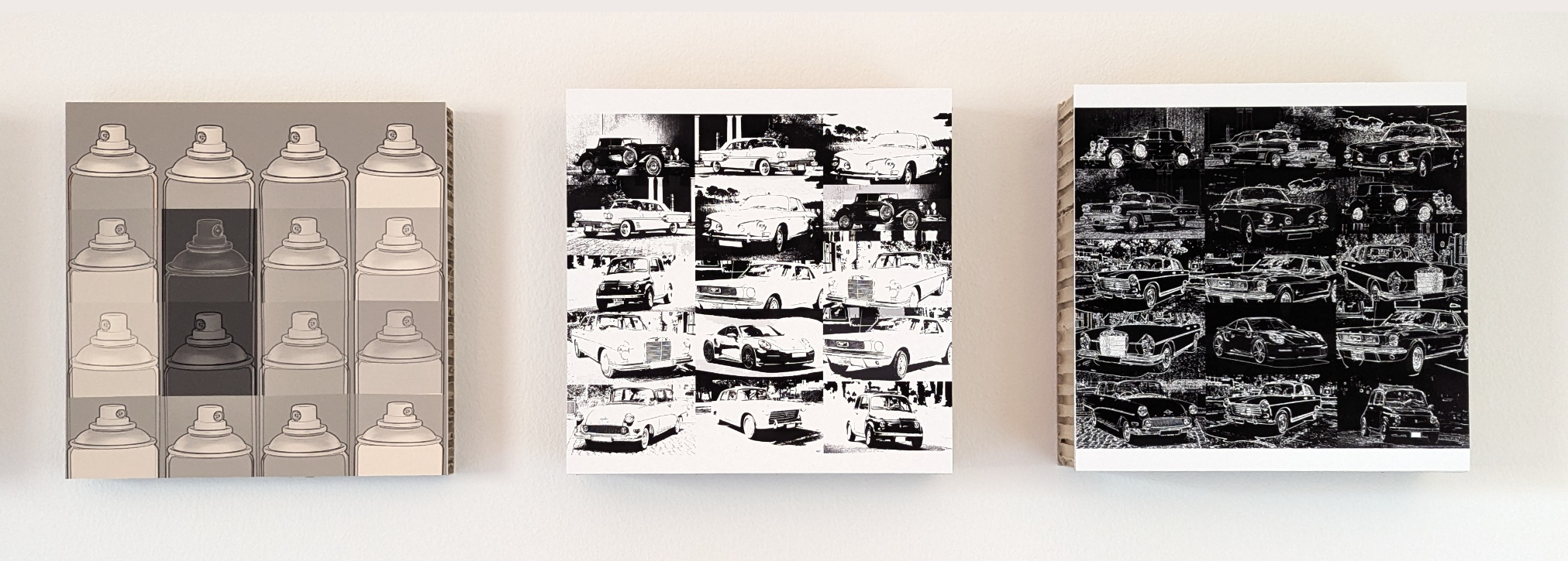 Die Einzelbilder dieser in einer Matrix angeordneten Objekte wurden mit einem Kantenfilter digital bearbeitet und mit verschiedenen Transparenzen überlagert Die Auswahl der Oldtimer ist zufällig und hat nichts mit irgendwelchen Vorlieben des Erstellers der Bilder zu tun. Einziges Kriterium für die Auswahl war, dass die Bilder leicht verfügbar sind, sich in das Grundkonzept gut einfügen und einen konsistenten Gesamteindruck ergeben.