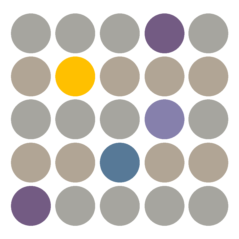 Die Festlegung auf 25 Punkte hat keine Bedeutung, sie erfolgte spontan, ist aber auch dem kleinen Format 30 x 30 cm geschuldet. Die Farben sind einfach Farben. Es ist eine Spielerei mit Punkten und Farben.