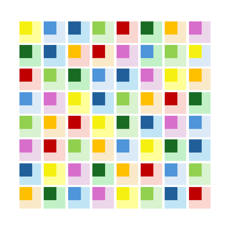 Ziel der Gestaltung war es, 8 Farben ähnlicher Farbigkeit in einer Reihe anzuordnen und diese dann in nicht-wiederholenden Permutationen zu einer 8x8-Matrix zu erweitern. In jeder Zeile und in jeder Reihe darf eine Farbe jeweils nur einmal auftreten. Die Reihenfolgen der Farben in einer Zeile und in einer Spalte dürfen nicht identisch sein. Die 8 Farben wurden nach gestalterischen Gesichtspunkten gewählt, es sollte jeweils ein R-, G-, B-Ton und ihre Komplementärfarbtöne CMY vorhanden sein, Cyan wurde in ein helleres Blau abgeändert, hinzugefügt wurden ein helleres Grün und Orange.