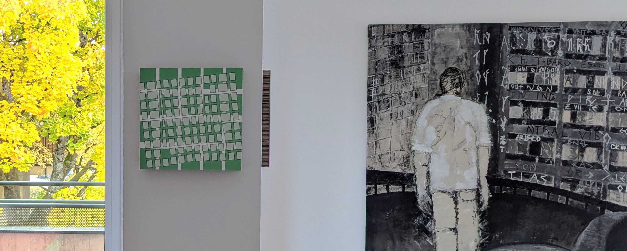 Die hier gezeigten Bilder sind eine Variane der arrays-Reihe. Die Bilder kombinieren die Grundmuster der arrays-Serie mit einem dem Grundmuster hinterlegten einfachen Muster aus regelmäßig angeordneten Rechtecken. Die Grundmuster sind leicht gedreht. Es wurde etwas Farbe hinzugefügt.