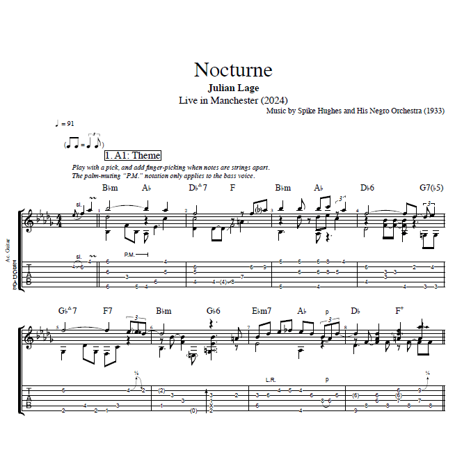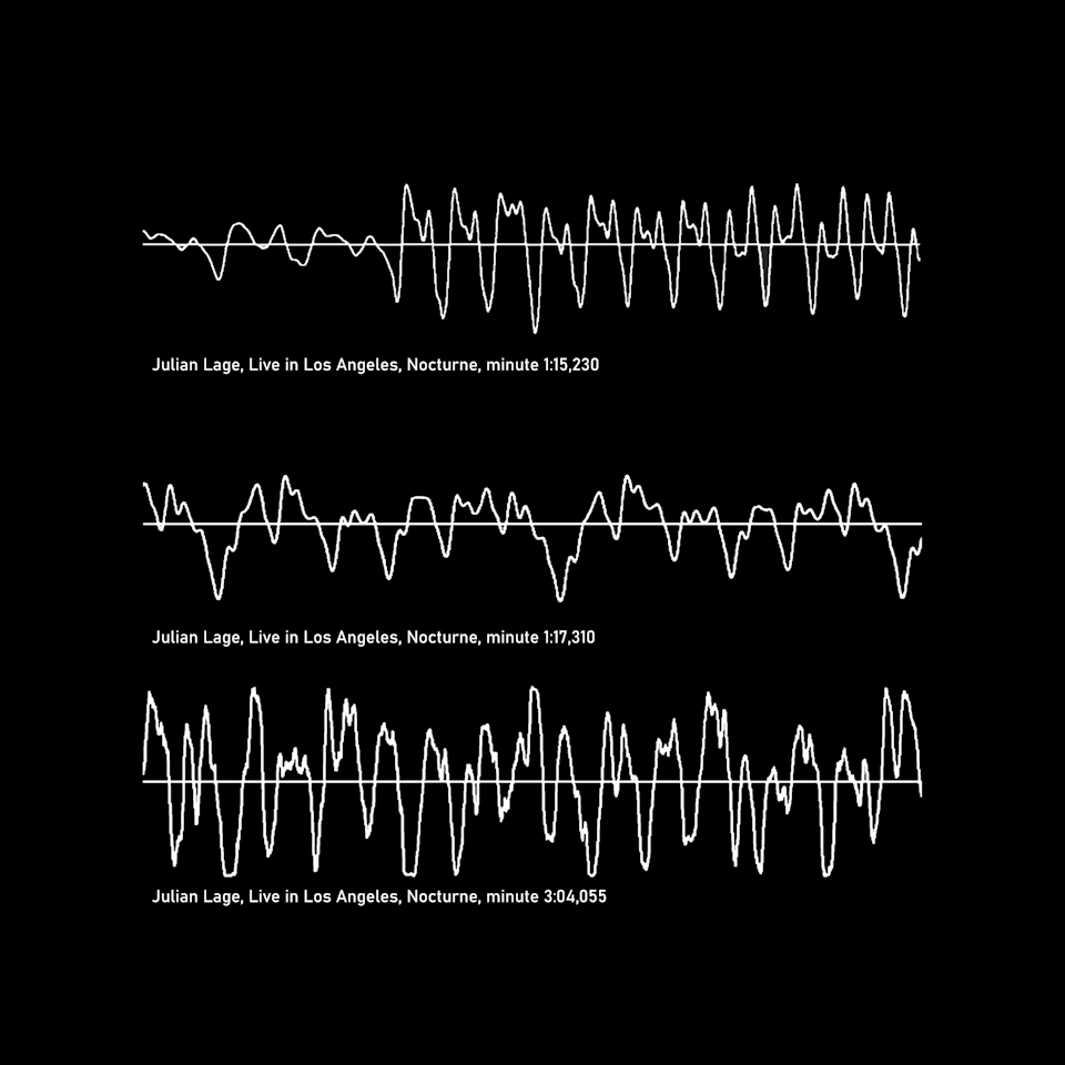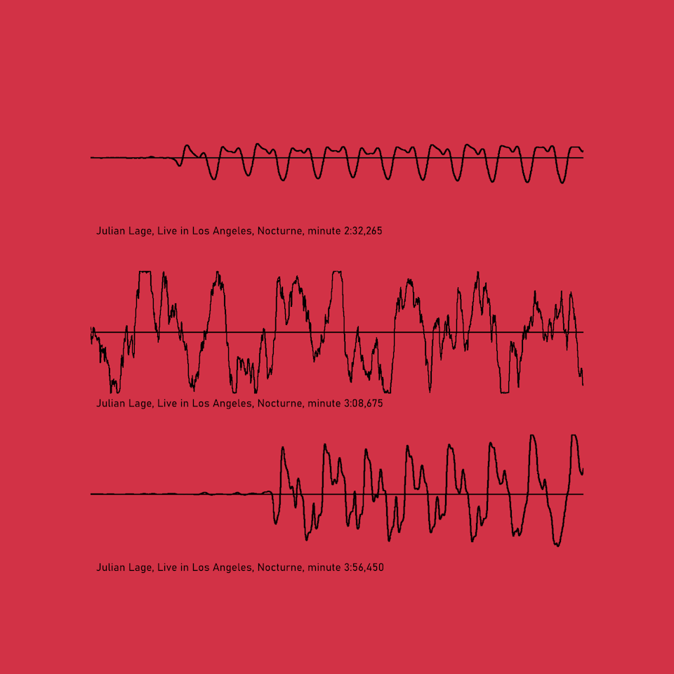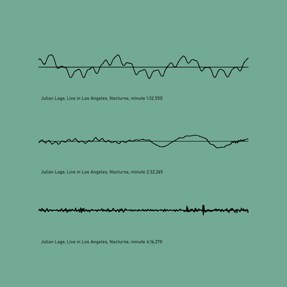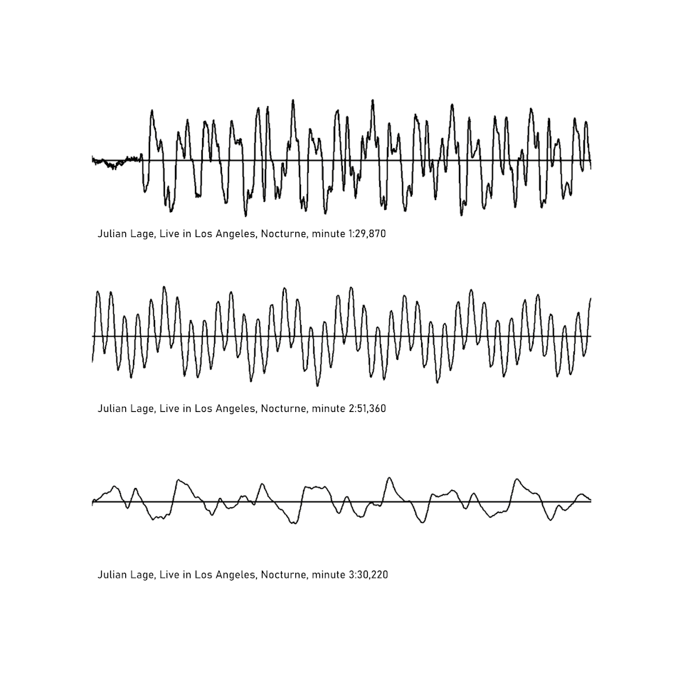 Die Bilder zeigen Auszüge aus dem Stück "Nocturne" aus dem Album "Live in Los Angeles" von Julian Lage aus dem Jahr 2016. Julian Lage ist ein außergewöhnlicher Gitarrist aus den USA. Die Bilder zeigen jeweils drei kurze Abschnitte des linken Stereokanals mit einer Signallänge von ca. 50 ms aus verschiedenen Abschnitten des Stücks. Als Hintergrund für die Bilder wurden die Farben des Albumcovers verwendet.